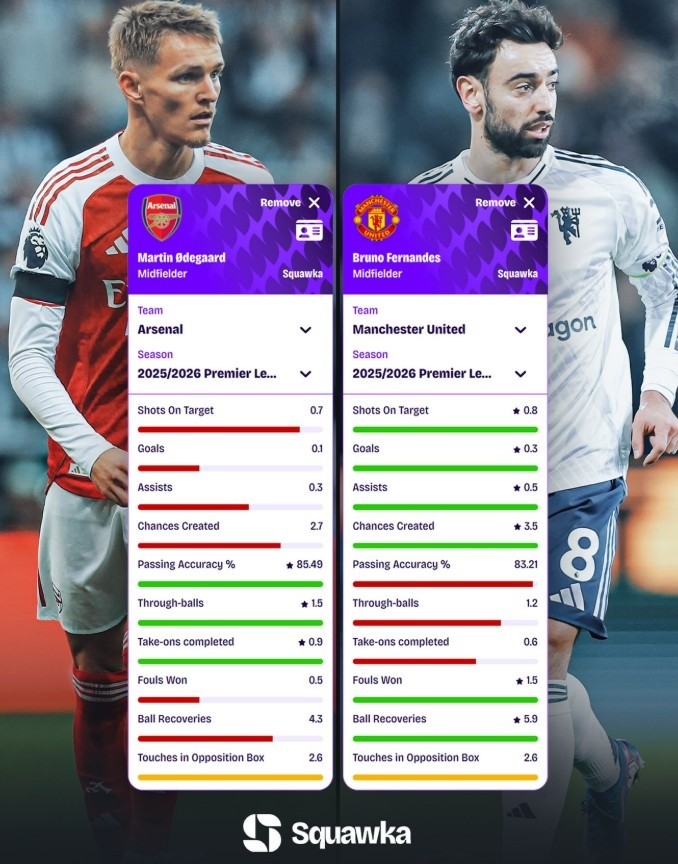 1月23日讯 本轮英超将迎来焦点战曼联对阵阿森纳,数据网站Squawka也盘点了两队中场厄德高、B费本赛季英超场均数据对比,具体如下: